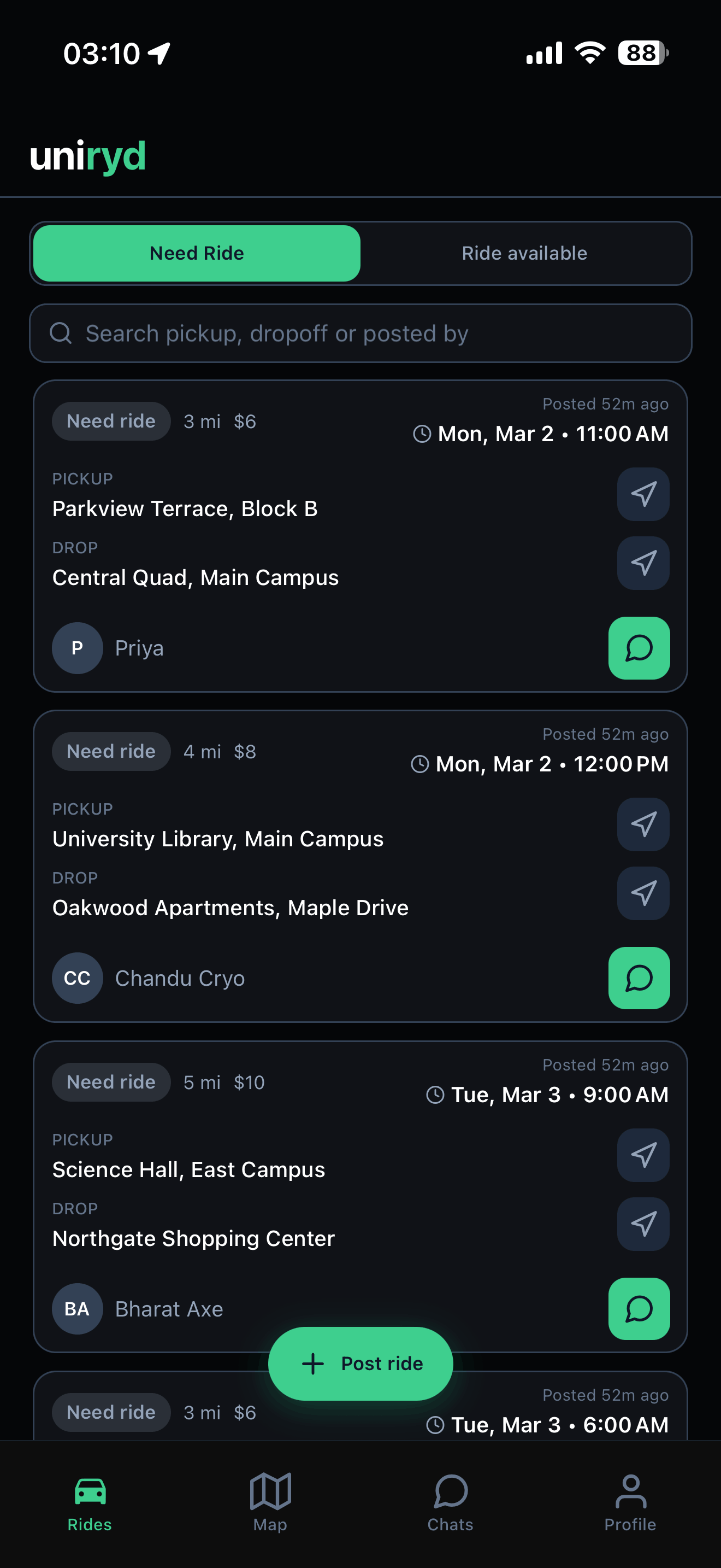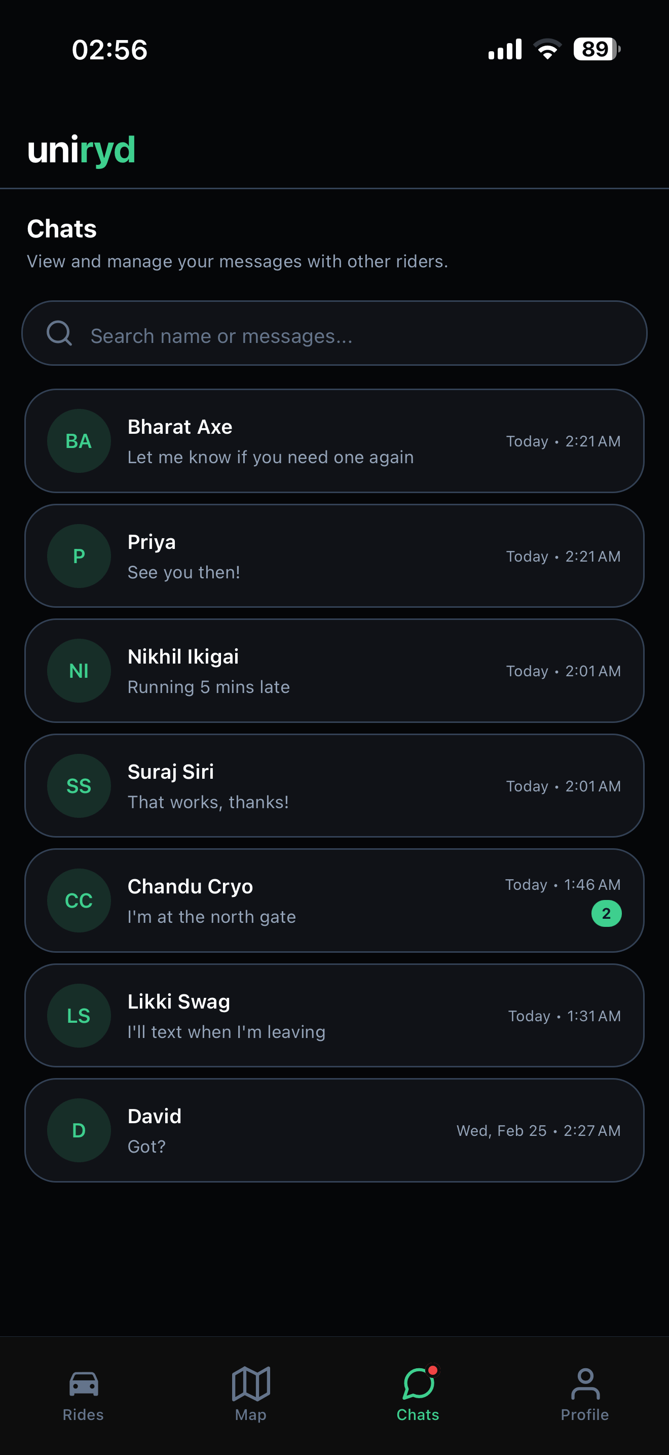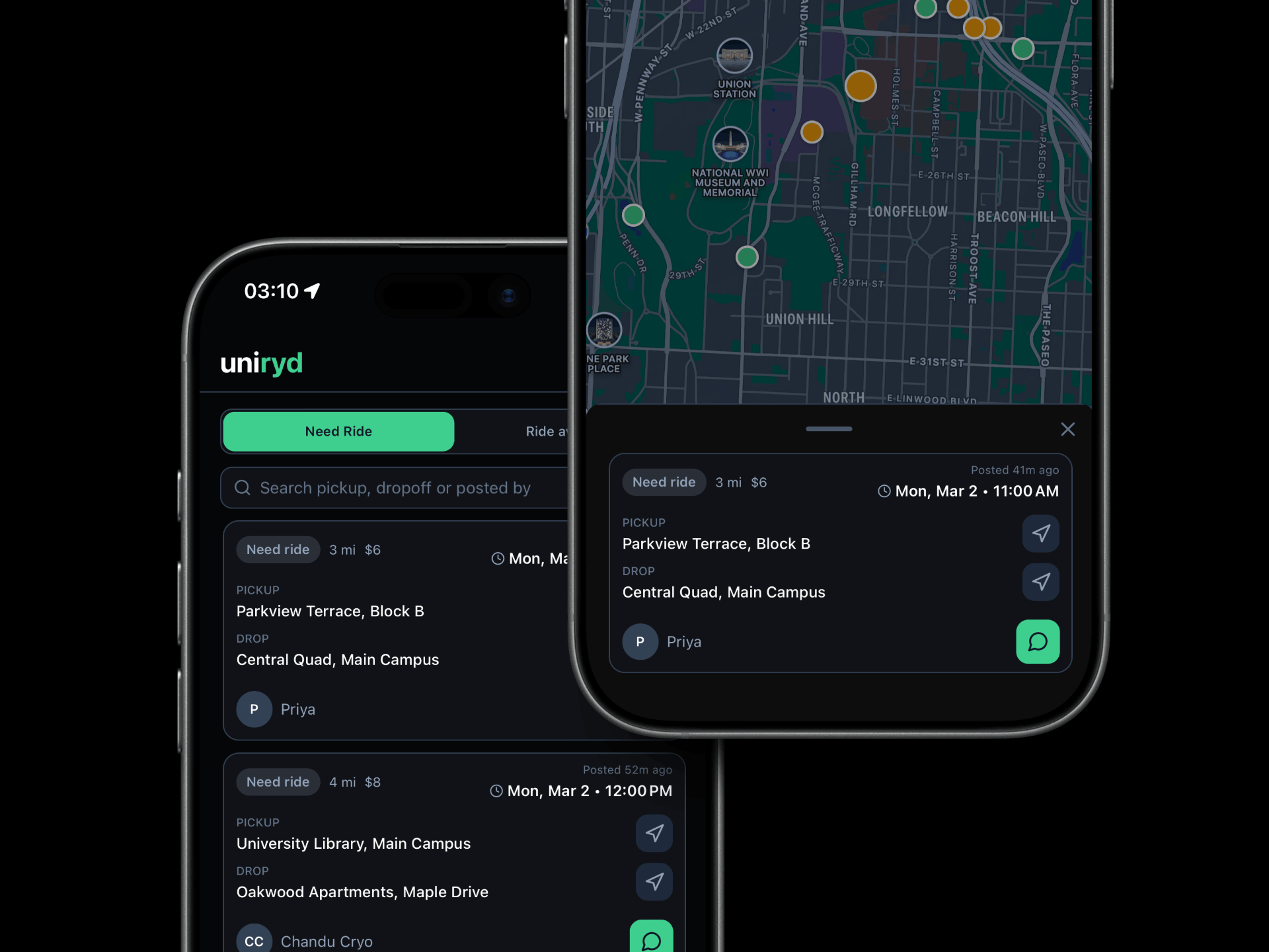 Your college community hub for shared rides and chat. No WhatsApp spam.