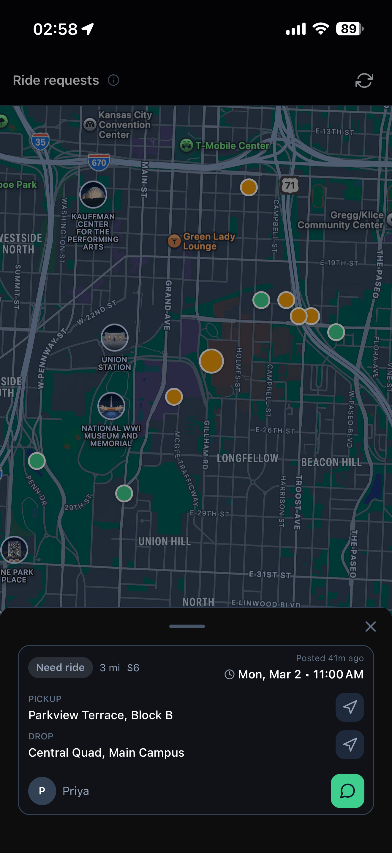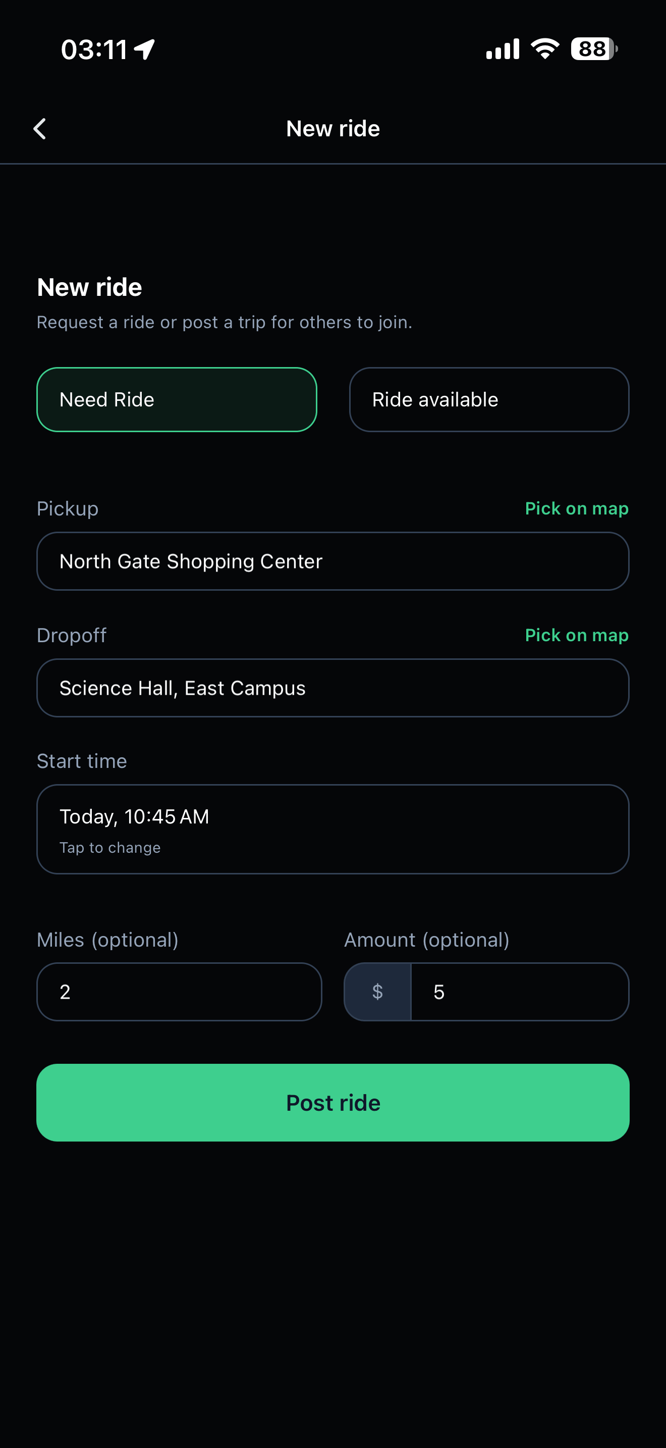 Your college community hub for shared rides and chat. No WhatsApp spam.